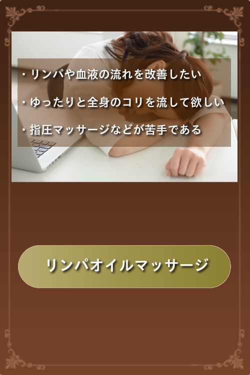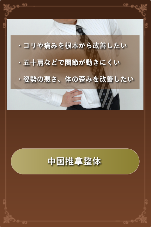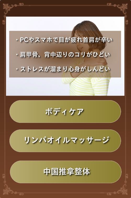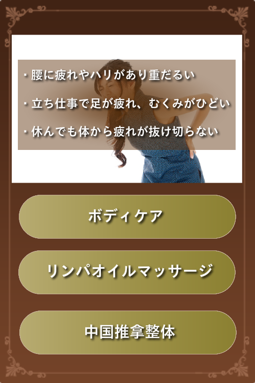 現在の指圧やマッサージの源流にもなっている、中国古来の伝統療法「推拿」を使った整体術や、推拿の理論を応用したリラクゼーションマッサージやリンパオイルマッサージ、足ツボリフレクソロジーの元祖とも言える「台湾式足ツボリフレクソロジー」などが皆様に大好評です!
