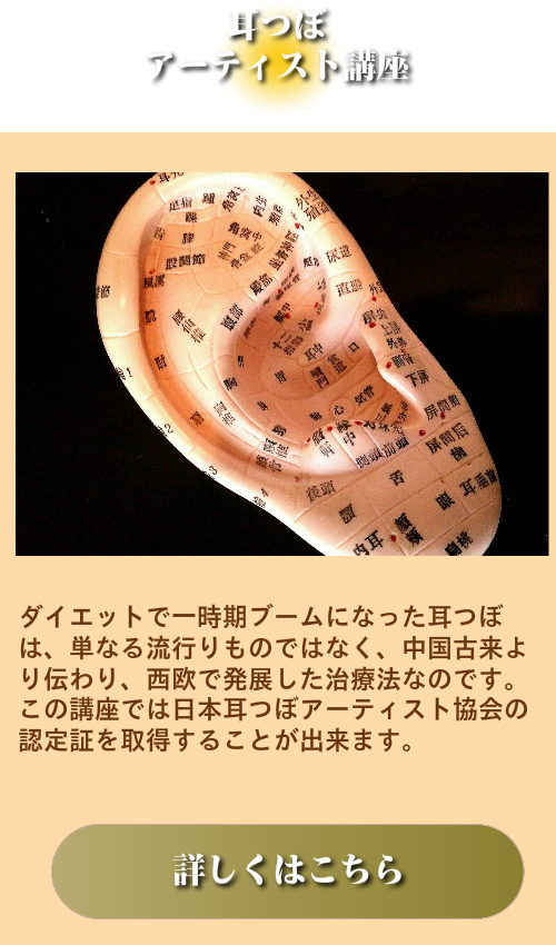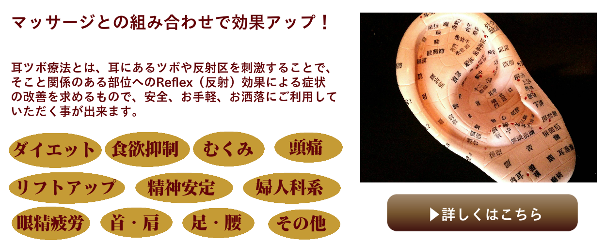 耳ツボ療法とは、耳にあるツボや反射区を刺激することで、そこと関係のある部位へのReflex(反射)効果による症状の改善を求めるもので、安全、お手軽、お洒落にご利用していただく事が出来ます。