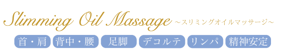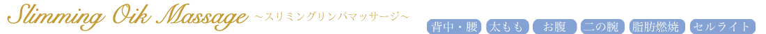 リンパオイルマッサージに加え、気になっている脂肪過多の部位を集中的に施術します。スリミング効果があるとされているオイルをお選びいただき、筋肉ほぐし、リンパ流しに「痩身」を目的に加えた手技療法です。