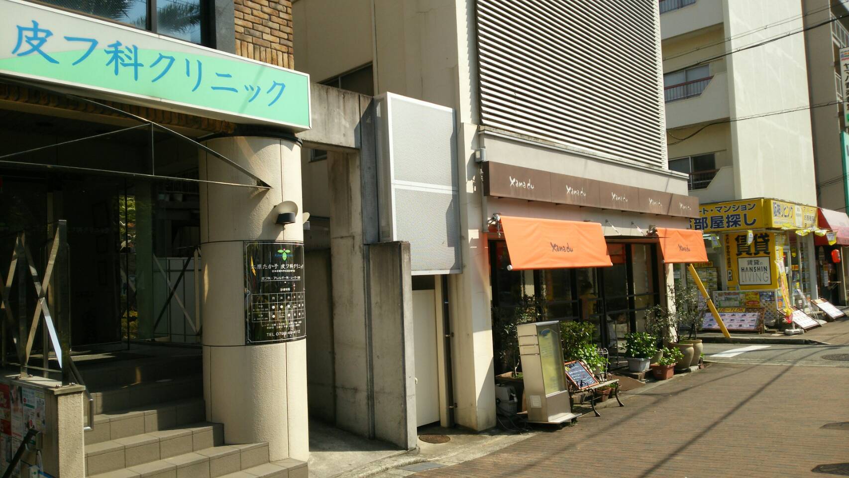 右手は車道、左手に木原孝子皮フ科クリニックさんがあり、美容室Xanadoさんと阪神リビングさんの間の道を左へ曲がります。